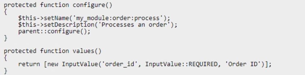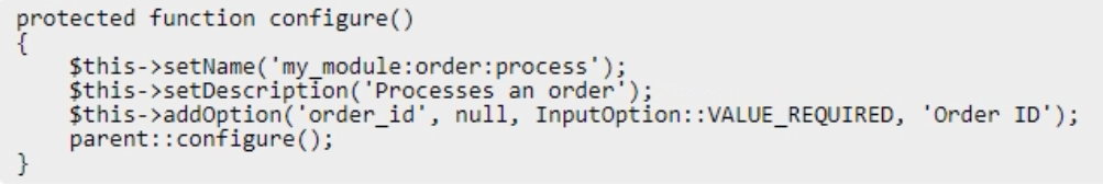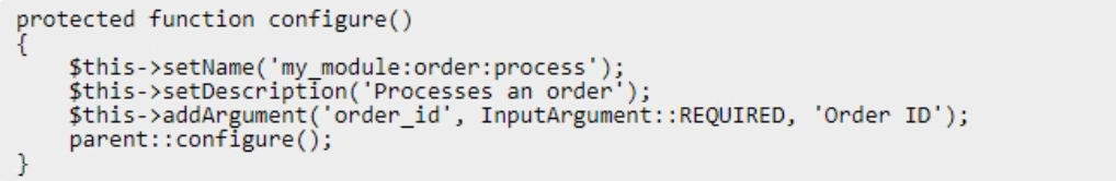 Example: php bin/magento my_module:order:process --order_id=1245.