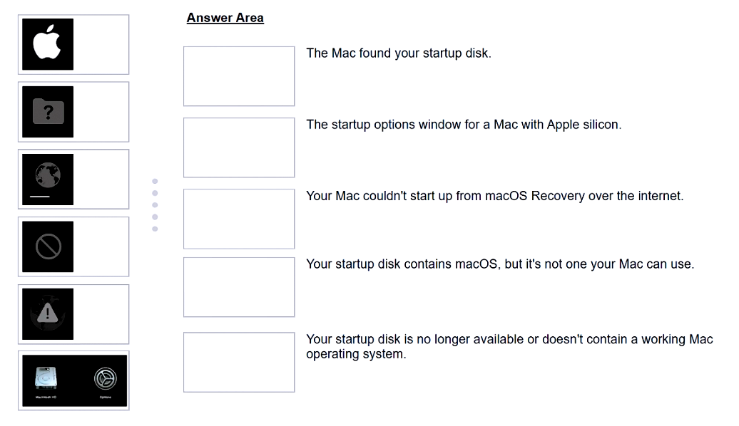 Match the startup icons on the left to the descriptions on the right by dragging the responses to the correct target areas. Responses may be used once, more than once, or not at all.