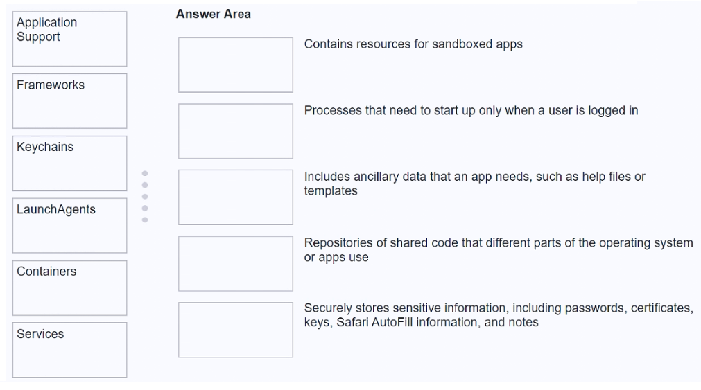 Match the macOS library resources listed on the left to the descriptions on the right by dragging responses to the correct target areas. Responses may be used once, more than once, or not at all.