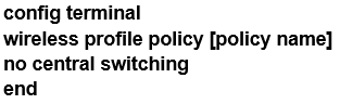 Which command set configures a Cisco Catalyst 9800 Series Wireless Controller so that the client traffic enters the network at the AP switch port?