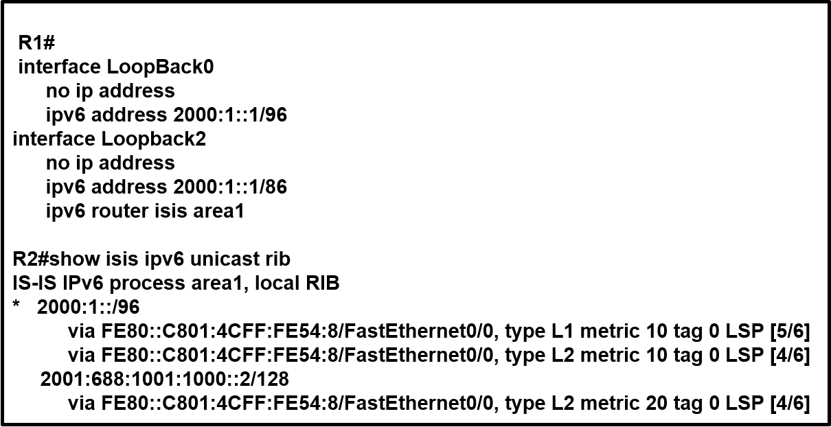 CRemove the ipv6 router isis area1 command under the Loopback2 interface on R1.