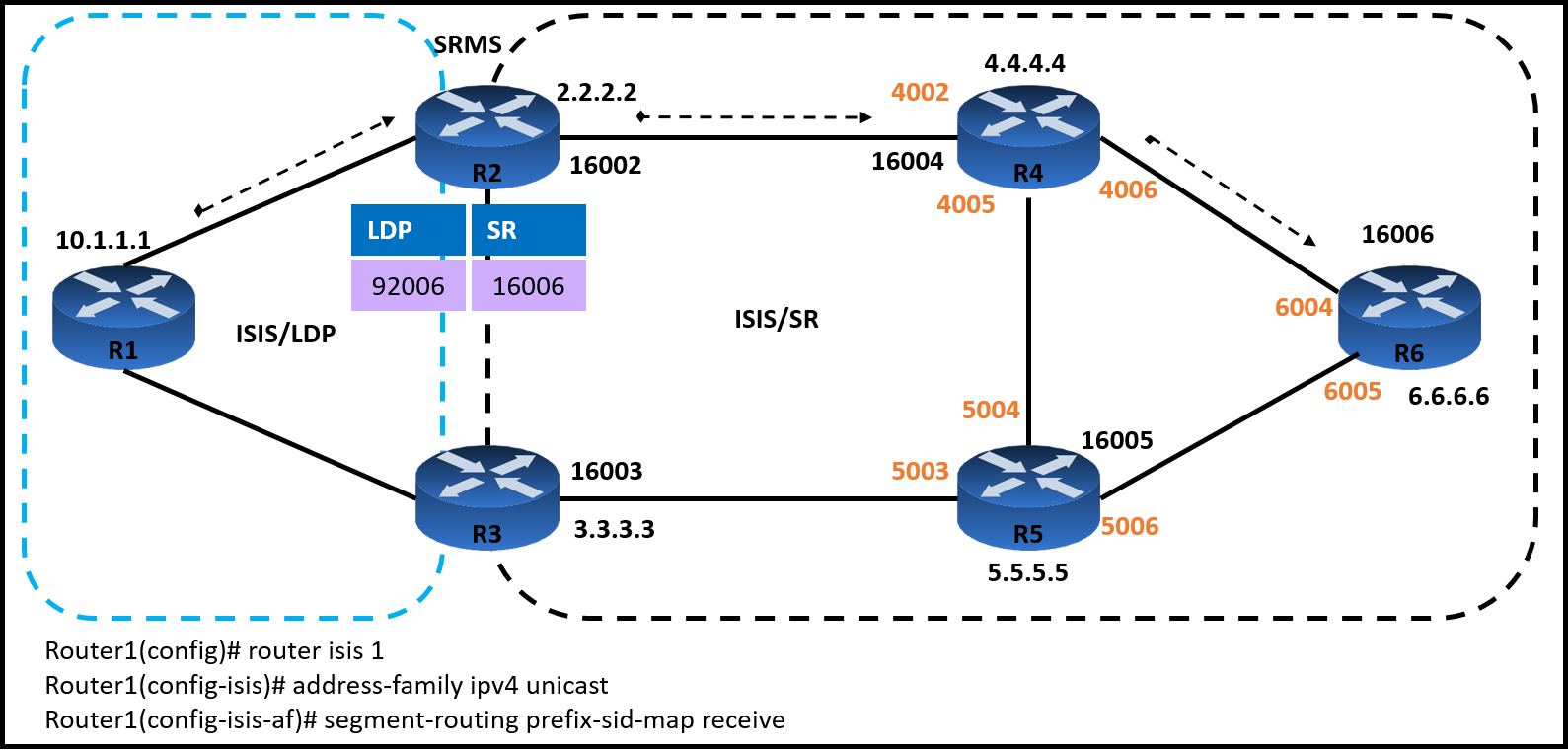 BRouter2(config)# segment-routingRouter2(config-sr)# sr mapping-serverRouter2(config-sr-ms)# ldp-sid-mapRouter2(config-sr-ms-map)# address-family ipv4Router2(config-sr-ms-map-af)# 10.1.1.1/32 500 range 50