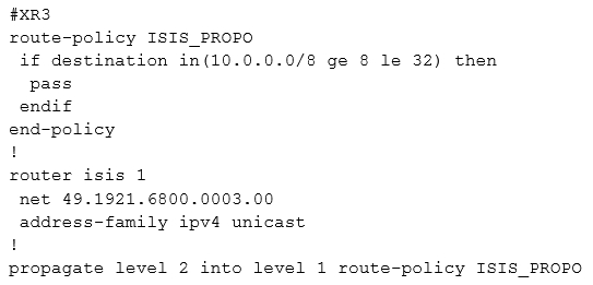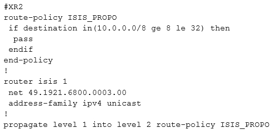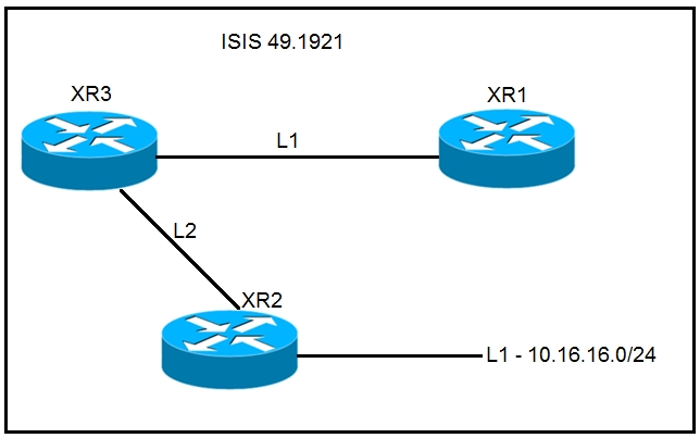 Refer to the exhibit. A network operator must inject a Level 1 route from XR2 (10.16.16.0/24) into the ISIS topology. Which configuration allows the injection in a way that XR3 and XR1 have a valid and working route for 10.16.16.0/24?