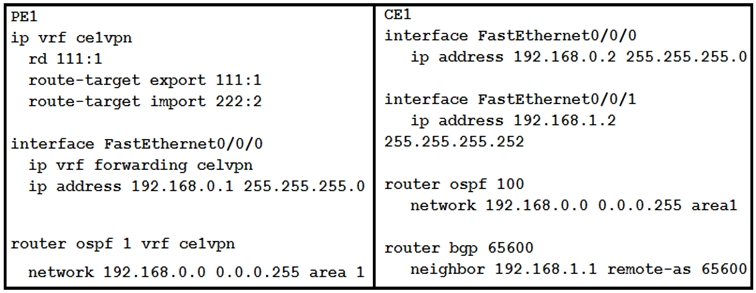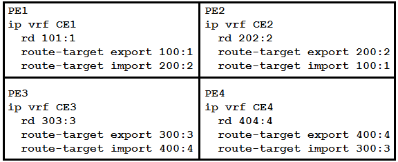 Refer to the exhibit. A network engineer has been called to configure the four PE devices in order to enable full communication among the four CE devices connected to them. While starting to configure, he experienced a connectivity issue. Which two tasks should the engineer perform in order to begin the process correctly? (Choose two.)