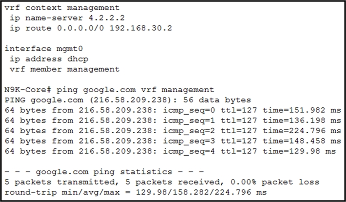 Refer to the exhibit. A network engineer connects the Cisco Nexus switch management port to the Internet using DHCP to allow the Guest shell that runs on the switch to download Python packages. The engineer can ping google.com from the Cisco Nexus switch, but the Guest shell fails to download Python packages.