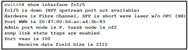 Refer to the exhibit. Interface fc1/5 is offline. Which action should be taken to troubleshoot the issue?