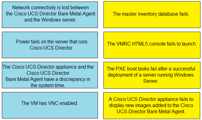 An engineer troubleshoots issues in Cisco UCS Director. Drag and drop the possible causes of the issues from the left onto the corresponding issues on the right.