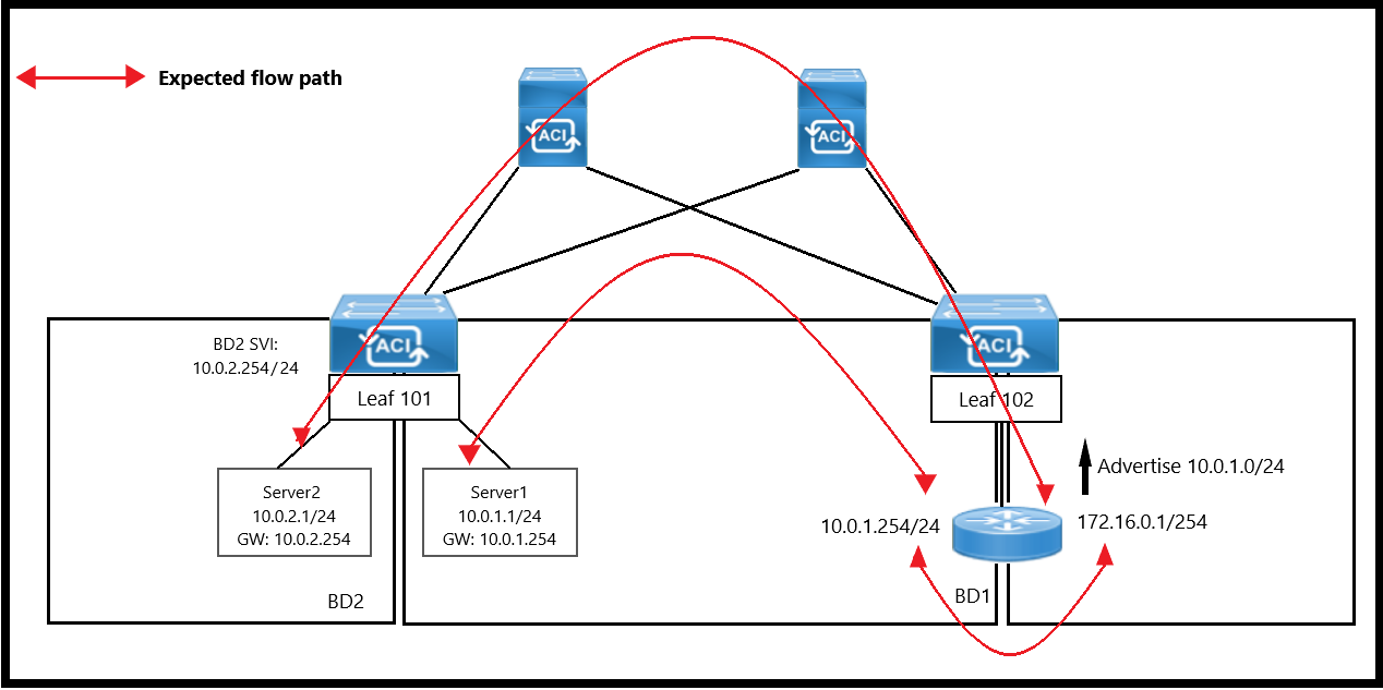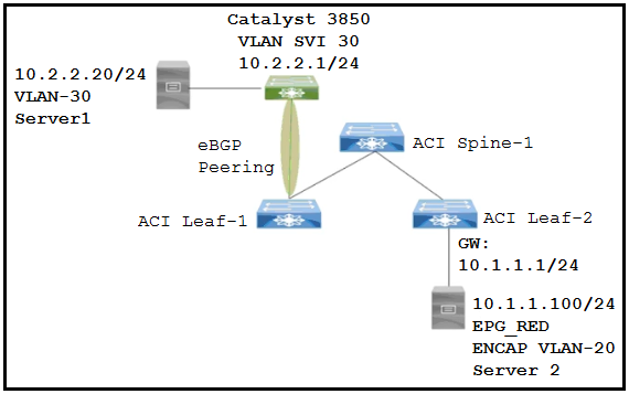 Refer to the exhibit. Cisco ACI fabric is connected to a Cisco Catalyst 3850 Series Switch using EBGP. Server 2 is unable to communicate with Server 1. Leaf-2 fails to learn the external subnet 10.2.2.0/24 and other external subnets from other L3Outs. Which configuration ensures that the networks from Leaf-2 are learned by the external network?