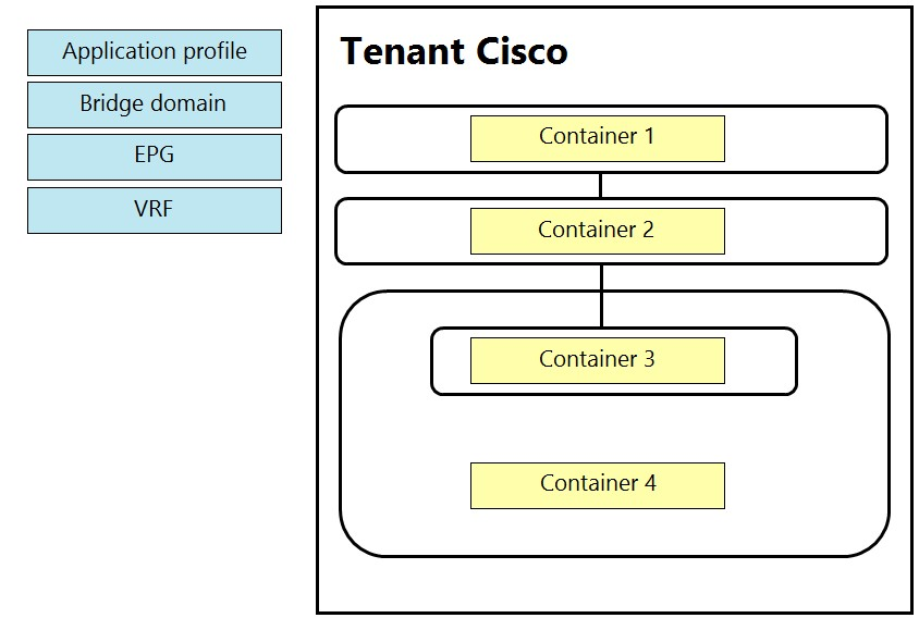 An engineer is configuring a VRF for a tenant named Cisco. Drag and drop the child objects on the left onto the correct containers on the right for this configuration.