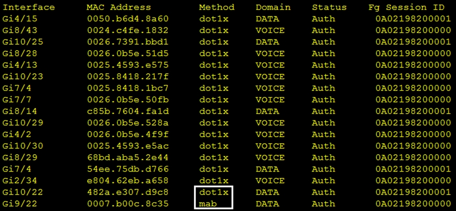 Refer to the exhibit. Which command was used to generate this output and to show which ports are authenticating with dot1x or mab?
