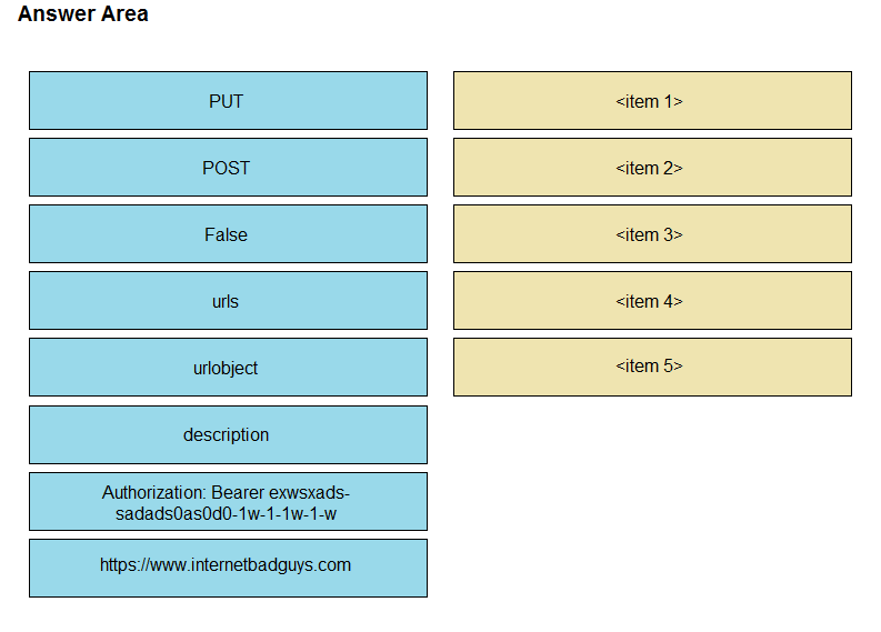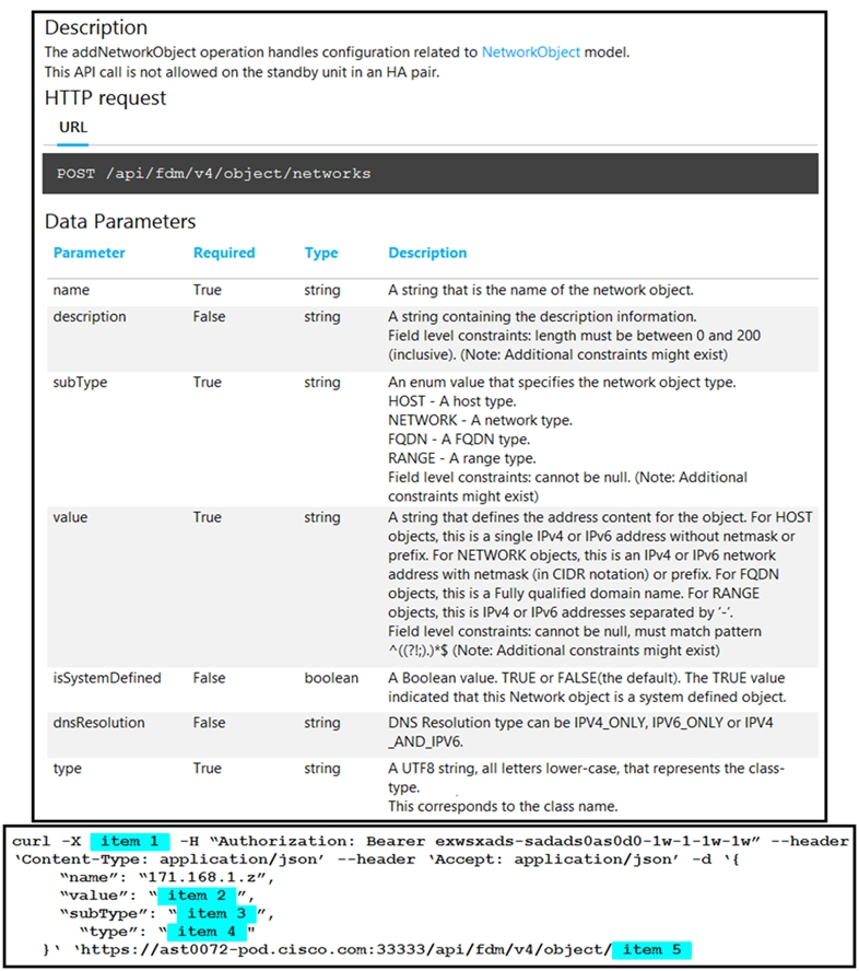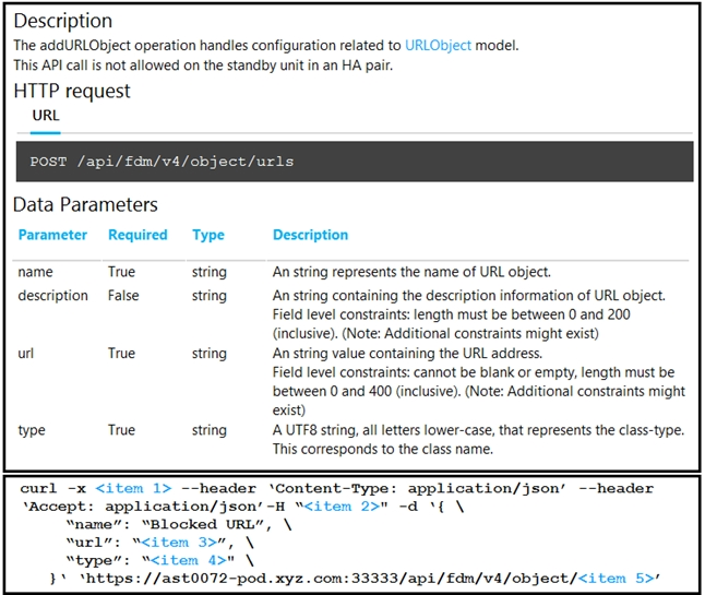 Refer to the exhibit. Drag and drop the code snippets from the left onto the item numbers on the right that match the missing sections in the curl exhibit to complete the cURL request to FirePower Device Manager API to create objects. Not all code snippets are used.