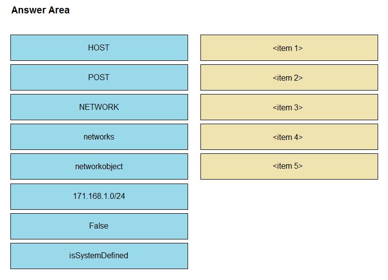Refer to the exhibit. Drag and drop the code snippets from the left onto the item numbers on the right that match the missing sections in the cURL exhibit to complete the cURL request to FirePower Device Manager API to create objects. Not all code snippets are used.