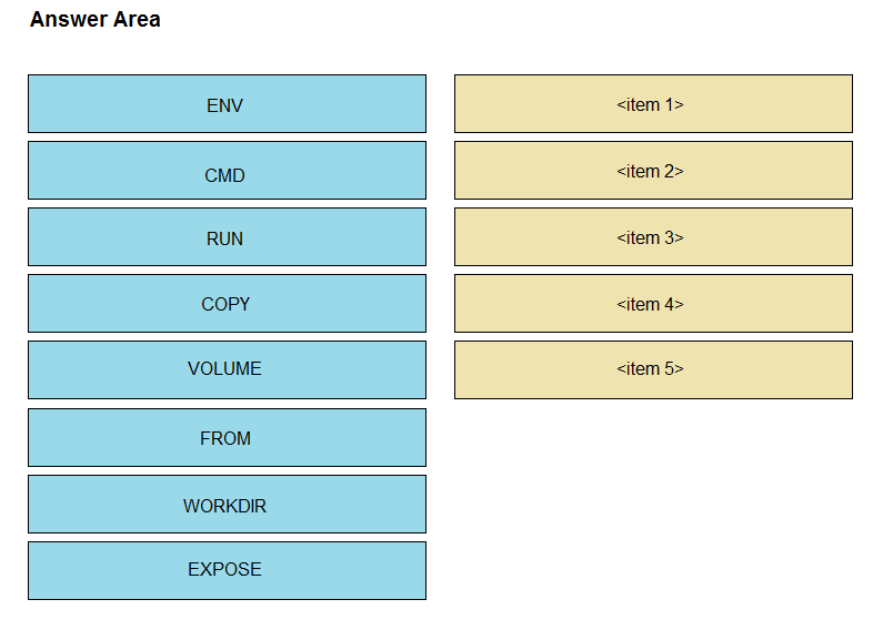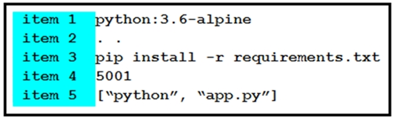 Refer to the exhibit. Drag and drop the correct parts of the Dockerfile from the left onto the item numbers on the right that match the missing sections in the exhibit to complete the Dockerfile to successfully build and deploy a container running a Python application. Not all parts of the Dockerfile are used.