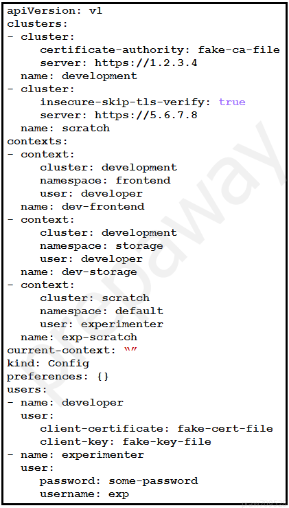 Refer to the exhibit. A kubeconfig file to manage access to clusters is provided.