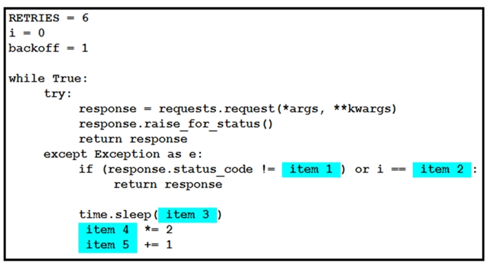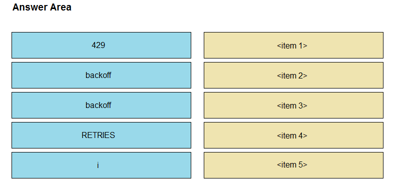 Refer to the exhibit. The self-service Webex bot is failing when many users attempt to interact with it at the same time. Drag and drop the code snippets from the left onto the correct item numbers on the right that match the missing sections in the exhibit to complete this code to handle this high-load situation.