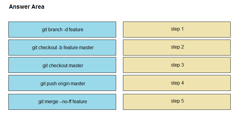 Drag and drop the git commands from the left into the correct order on the right to create a feature branch from the master and then incorporate that feature branch into the master.