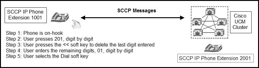 A user is performing a series of dialing steps on a SCCP IP phone (extension 1001) to call another SCCP IP phone (extension 2003). Both phones are registered to the same Cisco Unified Communications Manager cluster.
