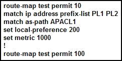 DThe local preference AND the metric will be set to 100 IF the route matches the PL1 OR PL2 prefix list AND the route must also match the APACL1 AS path access list.