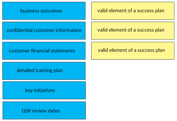 Drag and drop three valid elements of a success plan from the left to the right. Not all options are used.