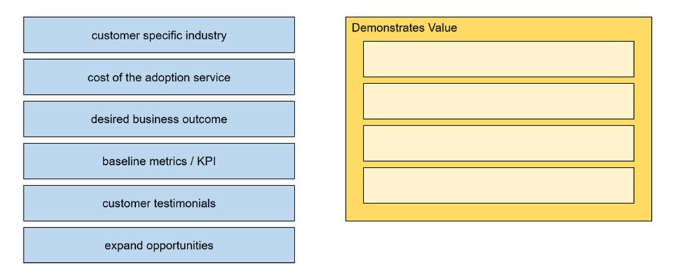 An external customer case study is being created. Drag and drop the contents which show value from the left onto the right. Not all content choices are used.