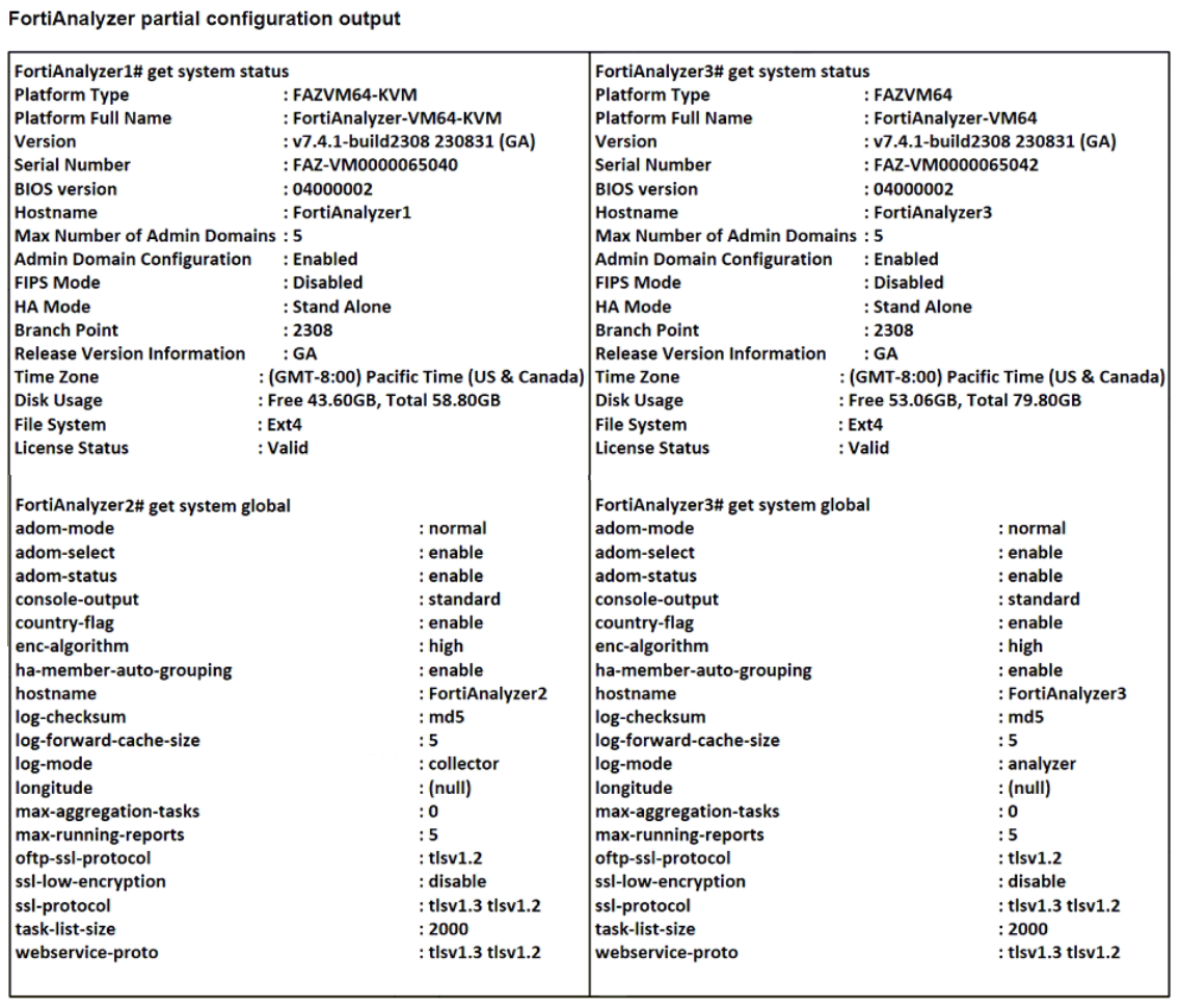 Based on the partial outputs displayed, which devices can be members of a FortiAnalyzer Fabric?