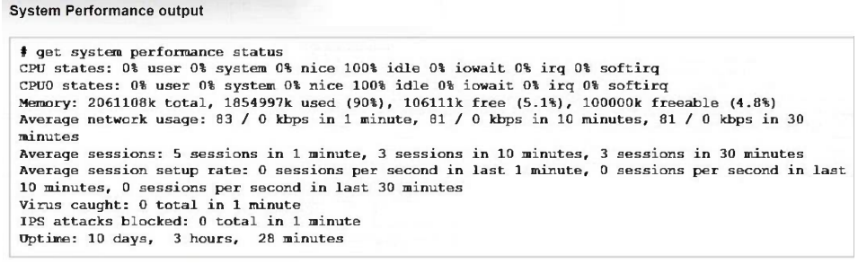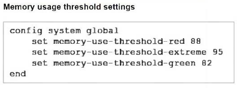 Log In / Sign UpRefer to the exhibits, which show the system performance output and the default configuration of high memory usage thresholds in a FortiGate.
