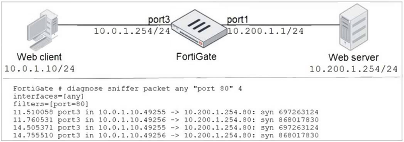 In the network shown in the exhibit, the web client cannot connect to the HTTP web server. The administrator runs the FortiGate built-in sniffer and gets the output shown in the exhibit.