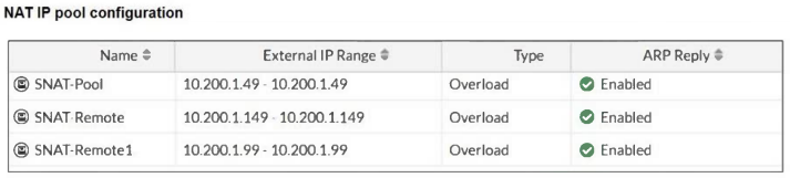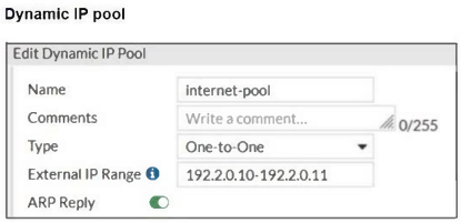The exhibits show a diagram of a FortiGate device connected to the network, as well as the IP pool configuration and firewall policy objects.
