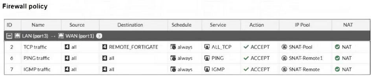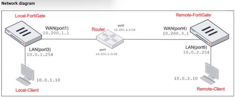 Which IP address will be used to source NAT (SNAT) the traffic, if the user on Local-Client (10.0.1.10) pings the IP address of Remote-FortiGate (10.200.3.1)?