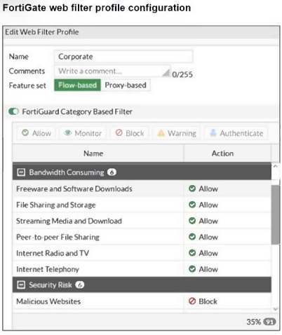The exhibit shows the FortiGuard Category Based Filter section of a corporate web filter profile.
