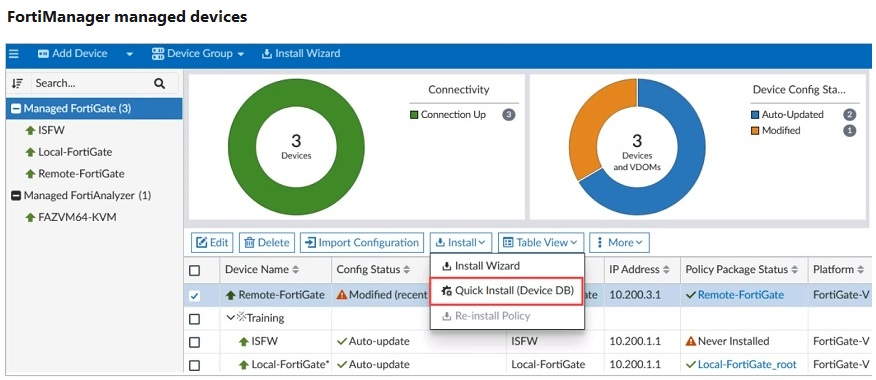You are using the Quick Install option to install configuration changes on the managed FortiGate.