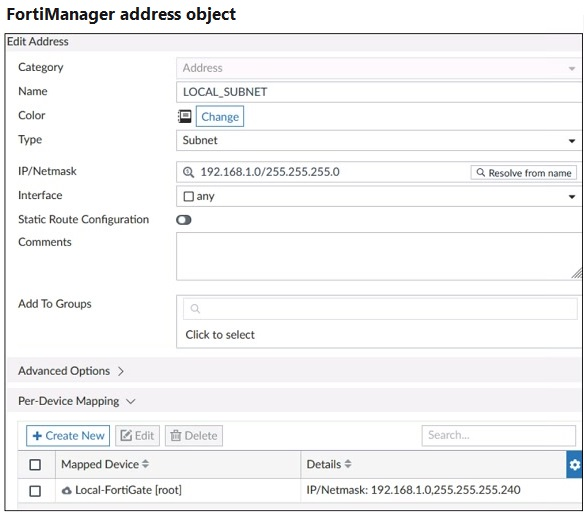 After the installation operation is performed, which IP/netmask is shown on FortiManager for this firewall address object for devices without a Per-Device Mapping set?