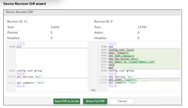 An administrator needed to recover all the configurations related to the user, Support. The configurations were saved in configuration revision ID 9.