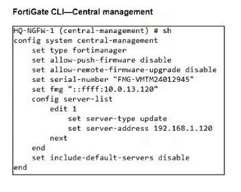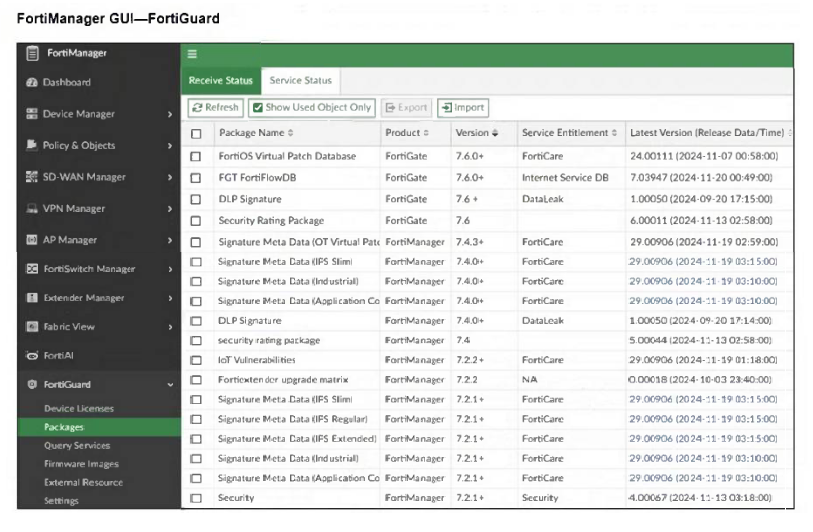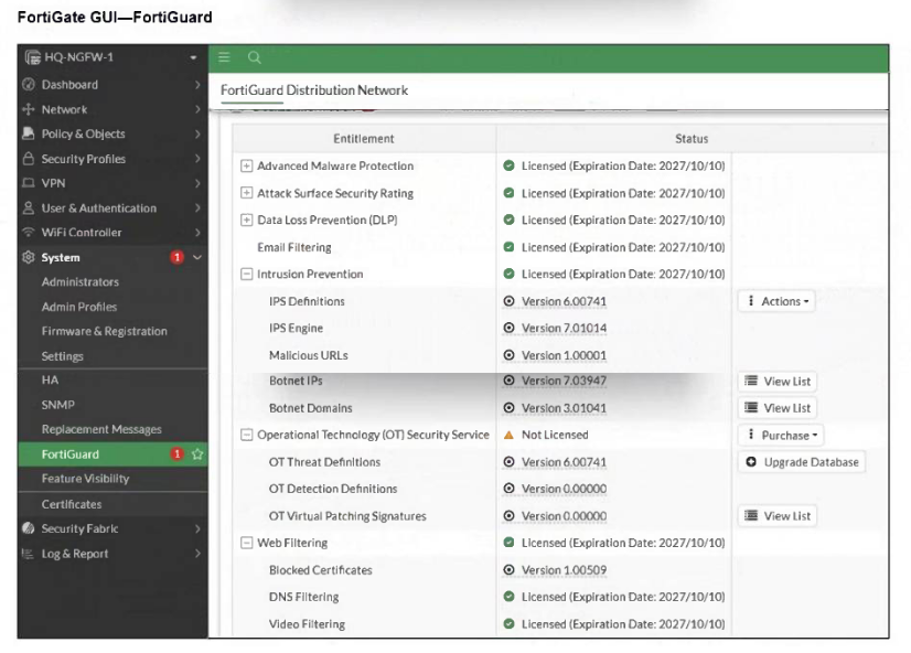 FortiGate HQ-NGFW-1 downloads and validates FortiGuard databases from FortiManager which acts as a local FortiGuard Distribution Server (FDS) in a closed network. An administrator pushes a new firewall policy with an intrusion prevention system (IPS) profile from FortiManager to FortiGate HQ- NGFW-1 However, FortiGate does not recognize the new IPS signature from FortiManager.