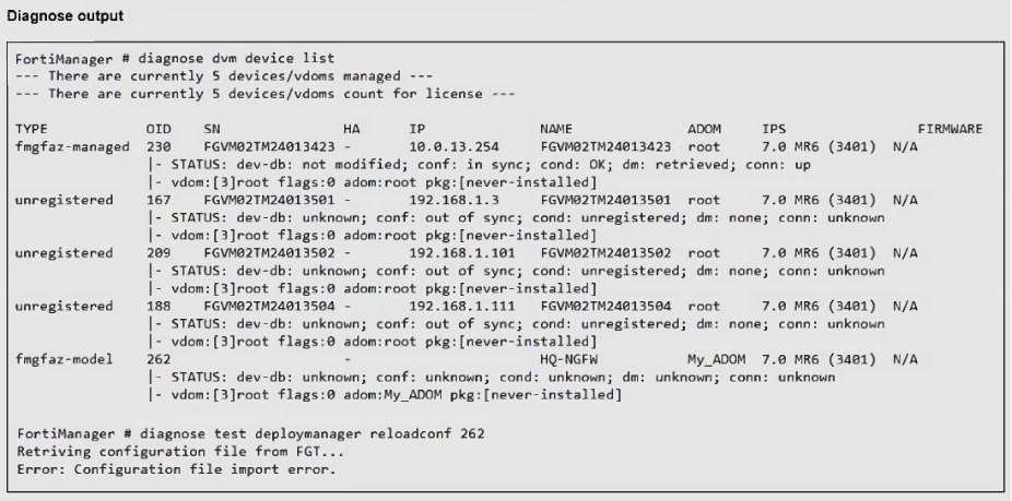 An administrator runs the reload failure command diagnose test deploymanager reloadconf 262 on FortiManager.