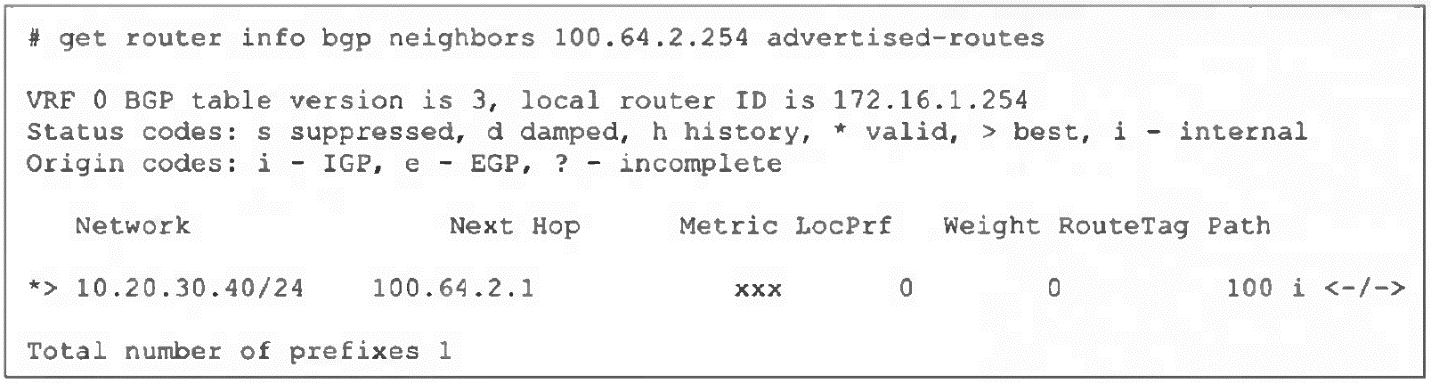 Refer to the exhibit, which shows the output of the command get router info bgp neighbors 100.64.2.254 advertised-routes.