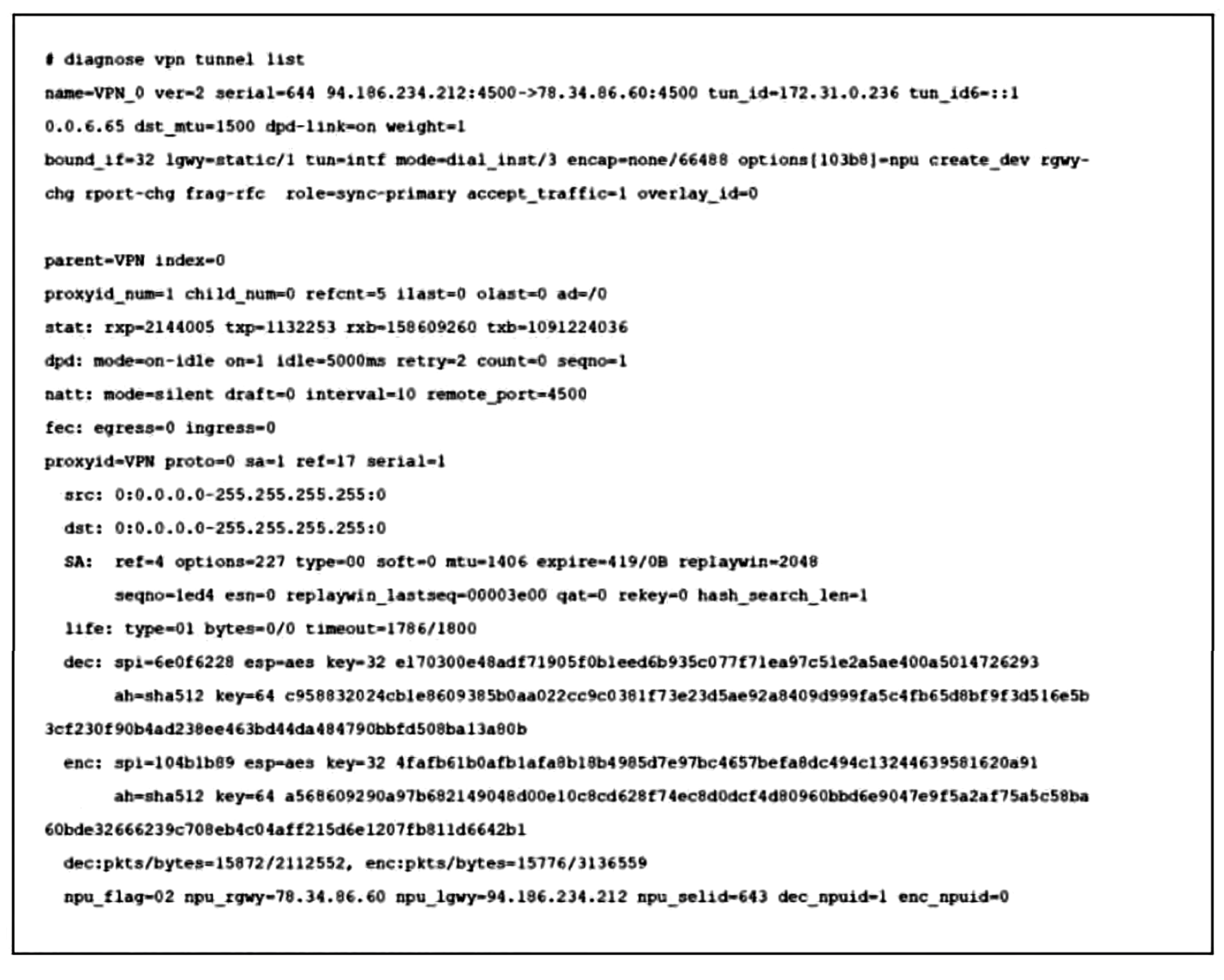 A VPN tunnel is up. To monitor traffic flow, the administrator enters the following CLI commands on an SSH session on FortiGate: