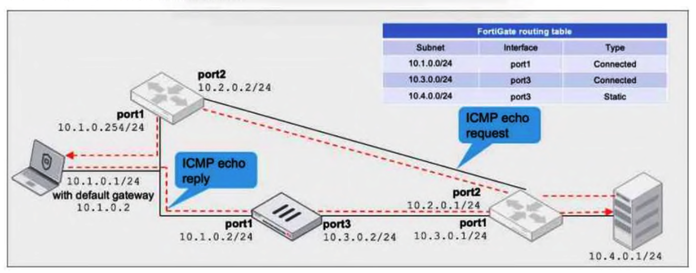 FortiGate has already been configured with a firewall policy that allows all ICMP traffic to flow from port1 to port3.