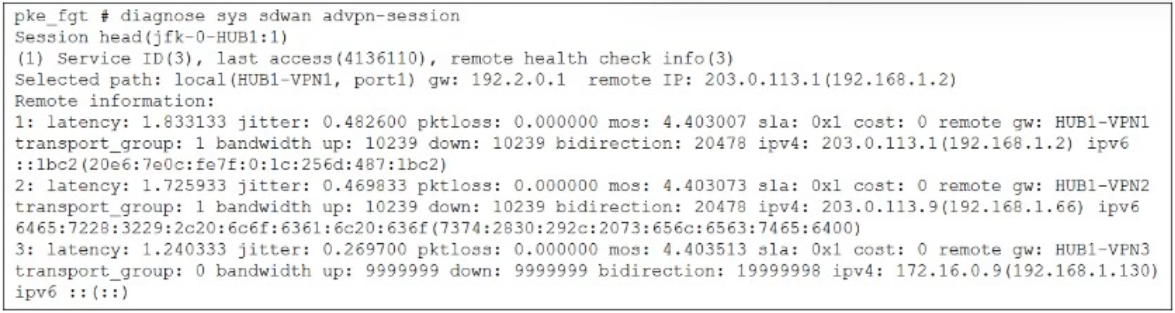 The health-check configuration on a FortiGate device used as a spoke is shown.