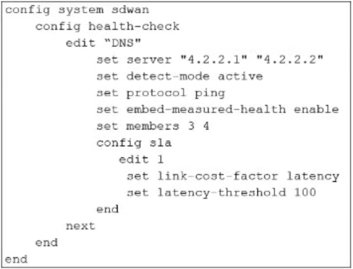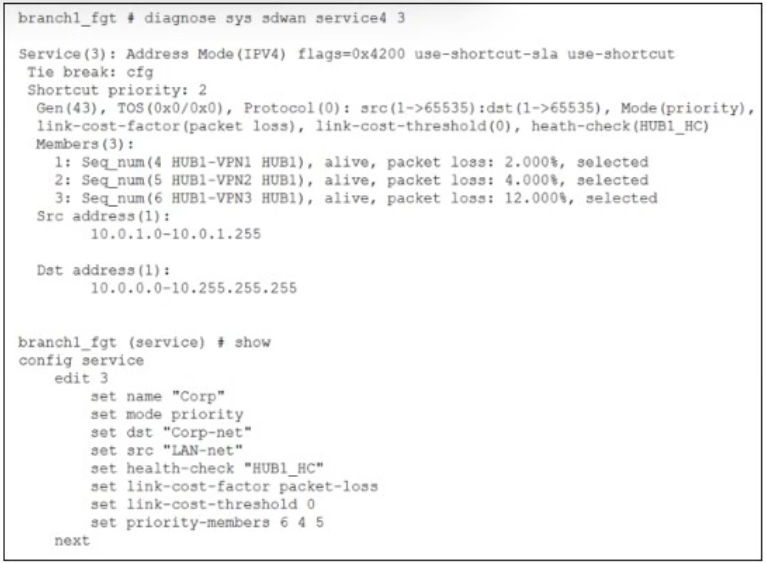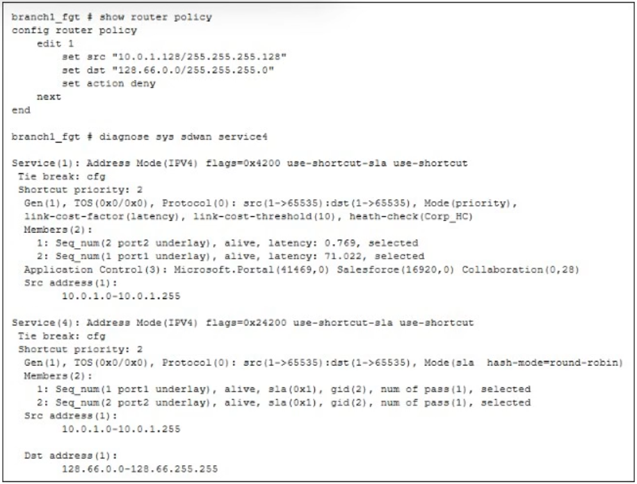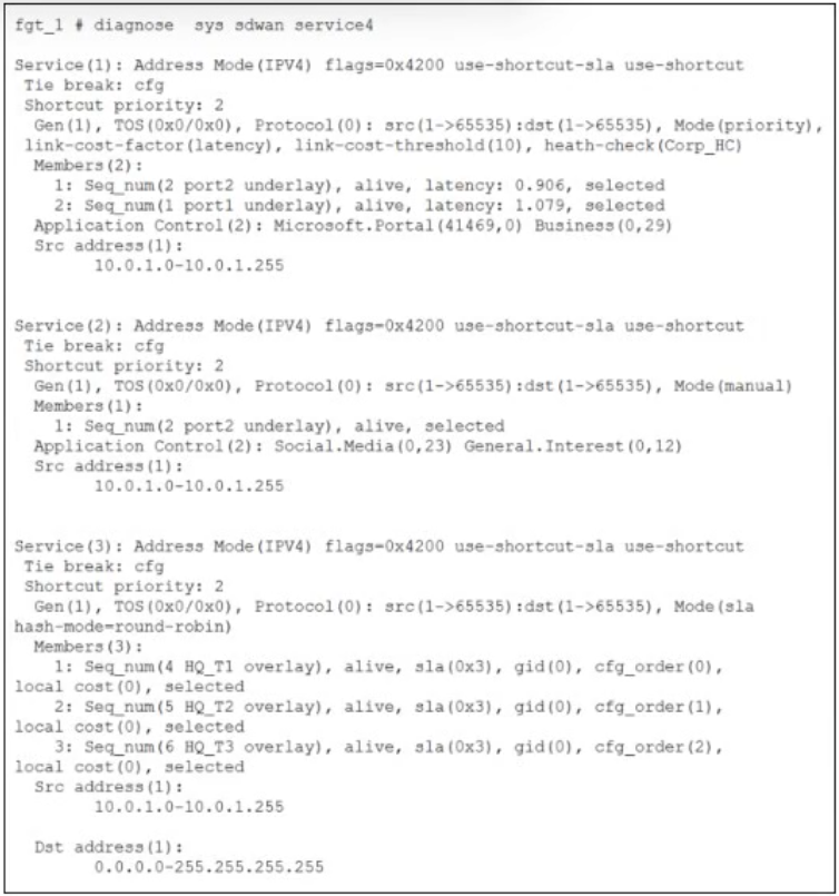 The exhibit shows output of the command diagnose sys sdwan service4 collected on a FortiGate device.