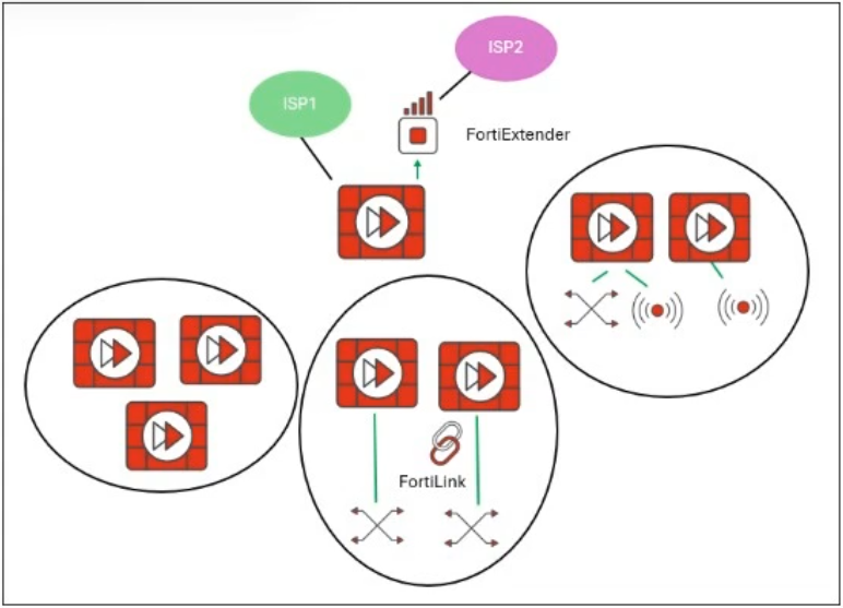 The network contains many FortiGate devices. Some are used as next-generation firewalls (NGFW), and some are installed with extensions such as FortiSwitch, FortiAP, or FortiExtender.