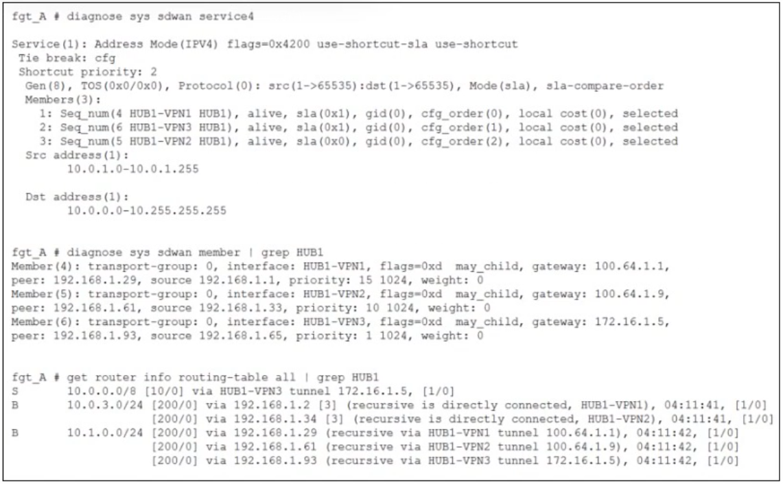 An administrator is troubleshooting SD-WAN on FortiGate. A device behind branch1_fgt generates traffic to the 10.0.0.0/8 network. The administrator expects the traffic to match SD-WAN rule ID 1 and be routed over HUB1-VPN1. However, the traffic is routed over HUB1-VPN.