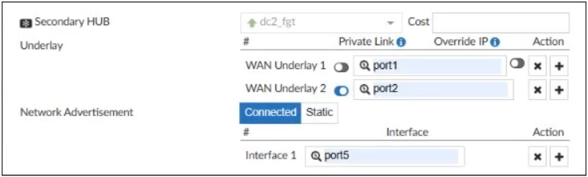 These are the configurations for the secondary hub of a dual-hub SD-WAN topology created with the FortiManager SD-WAN overlay orchestrator.