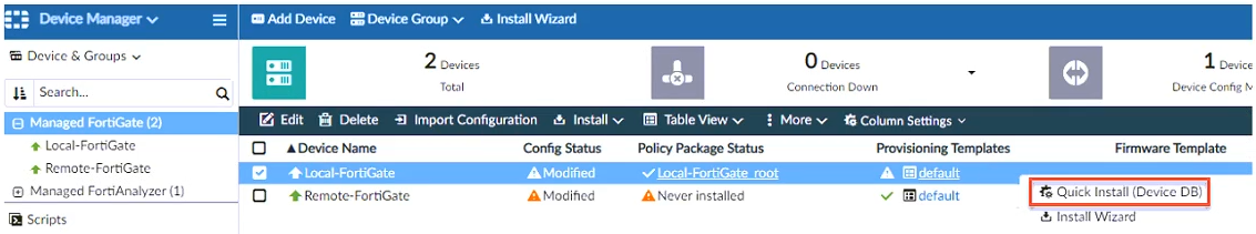You are using the Quick Install option to install configuration changes on the managed FortiGate.