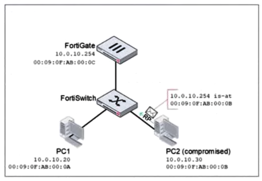 PC2 is compromised and attempts to spoof the FortiGate IP address by sending forged Address Resolution Protocol (ARP) replies with its own MAC address.