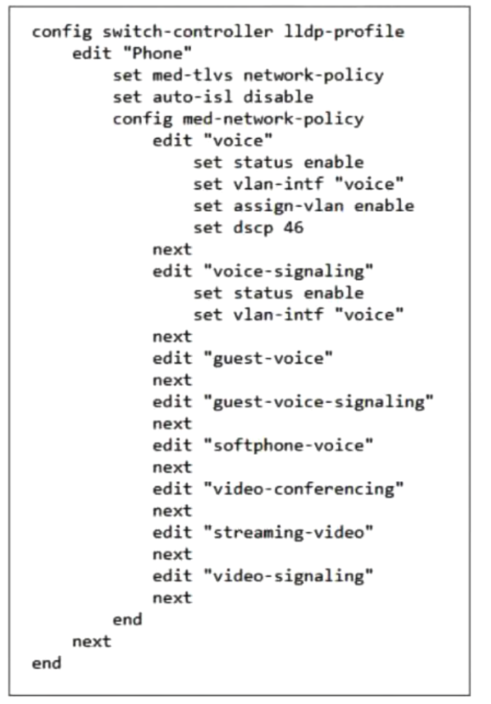 The LLDP profile shown in the exhibit was configured to detect IP phones and automatically assign them to the appropriate VLAN. You apply this LLDP profile on a FortiSwitch port.