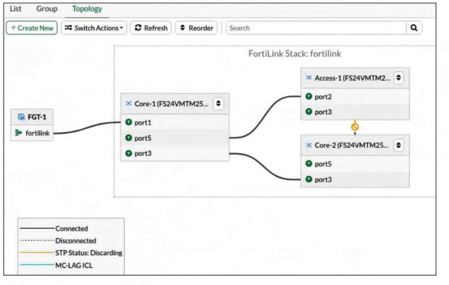 All switches are managed by FortiGate, which uses port4 as the FortiLink interface. After you enable the uplink ports on Core-2, you notice that port3 on Access-1 enters the Discarding STP state.