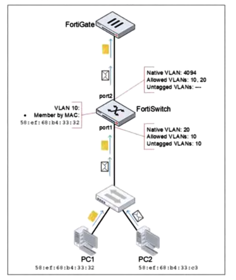 PC1 and PC2 are connected to port1 on FortiSwitch.