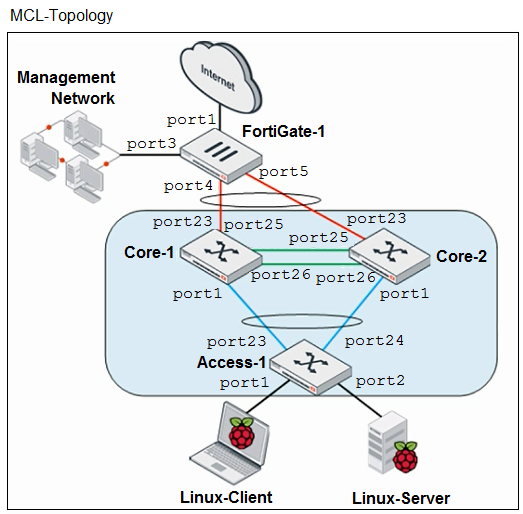 Core-1 and Access-1 are managed and authorized by FortiGate-1, which uses port4 as the FortLink interface. After FortiGate authorizes and manages Core-2, port1 status becomes STP discarding.