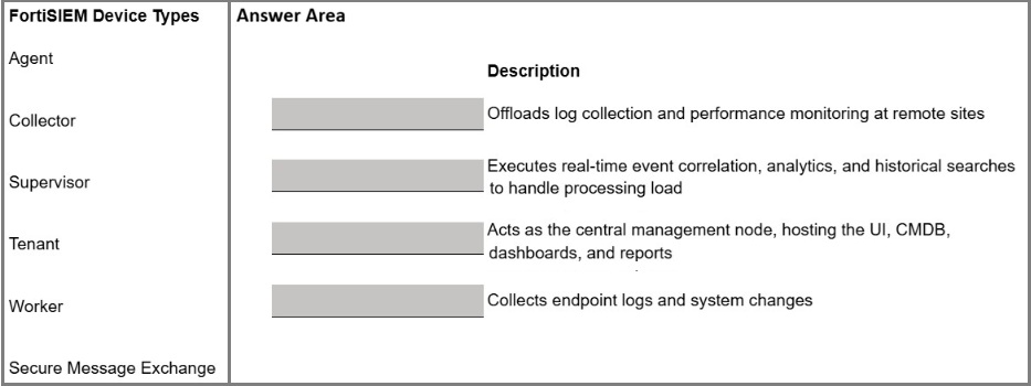 Select each FortiSIEM device type in the left column, hold and drag it to the blank space next to its corresponding description in the column on the right. Once you match a device type to its description, you can move it again if you want to change your answer by clicking on the device type name. You need to match four device types to its description in the work area.